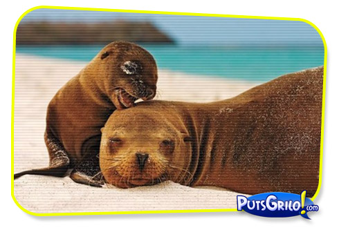 O filhote de foca fazendo um cafuné na mãe que dorme como um bebê encanta. É uma imagem belíssima, não?